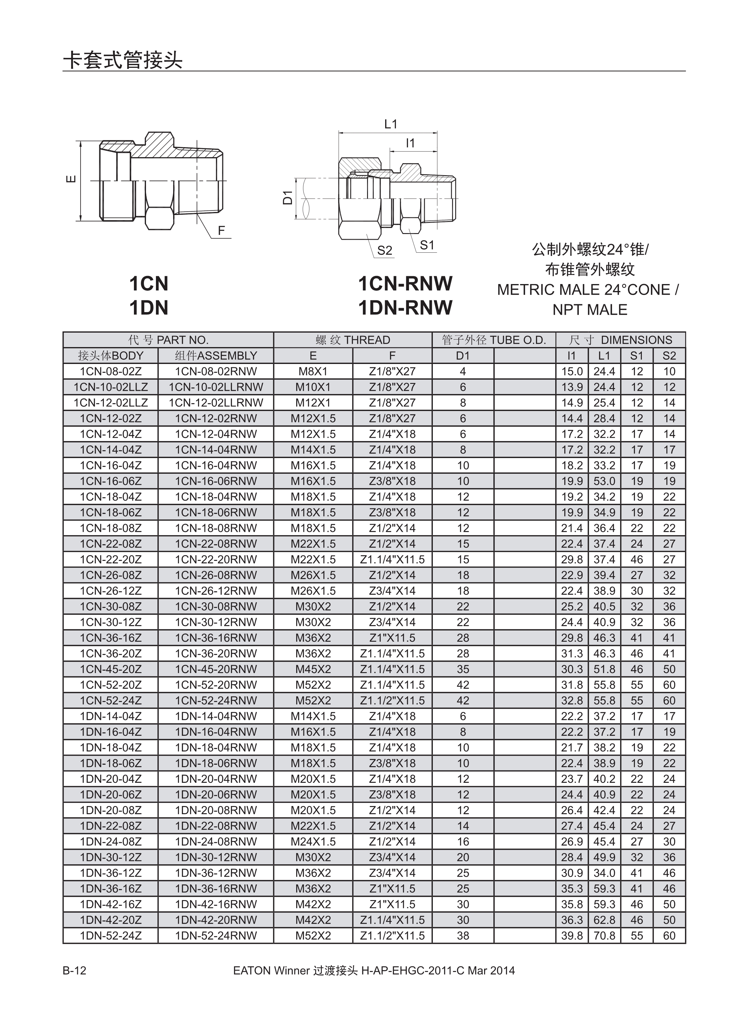 Metric thread bite type 24° seal tube fittings order instruction Sample instruction: 1CT-30-12 is light type fitting "L" series. 1DT-30-12 is heavy type fitting "S" series. ICT-30-12RN is one set fitting,include cutting ring and nut. 1DT-30-12RN is one set fitting, include cutting ring and nut. "9" in part no. means 90° elbow, "4" in part no. means 45° elbow.